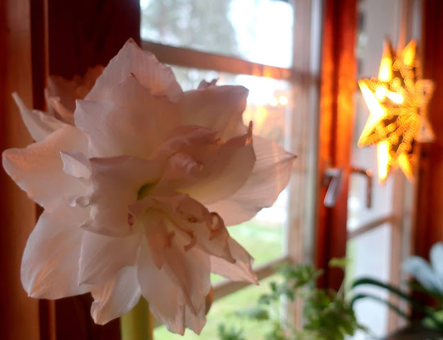 Amaryllis är favoritblomman så här års. Har fyra stycken i blomning just nu. Ett par av lökarna skjuter nya knoppar, så det lär nog blir blomning fram till "lilla jul". ( Lilla jul är första helgen i februari, Kyndelmässodagen)För en dryg månad sedan var jag i utkanten av Borås, för att köpa bra "gåskor". Fotriktigt heter affären som säljer skor av hög kvalitet, inläggssulor mm. Dessutom provar man ut personliga sulor, efter tidsbokning.